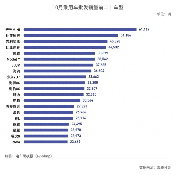 据乘联分会数据,10月乘用车批发销量超过2万辆的车型达到32个,高于上月的25个,其中新能源车型占20个。