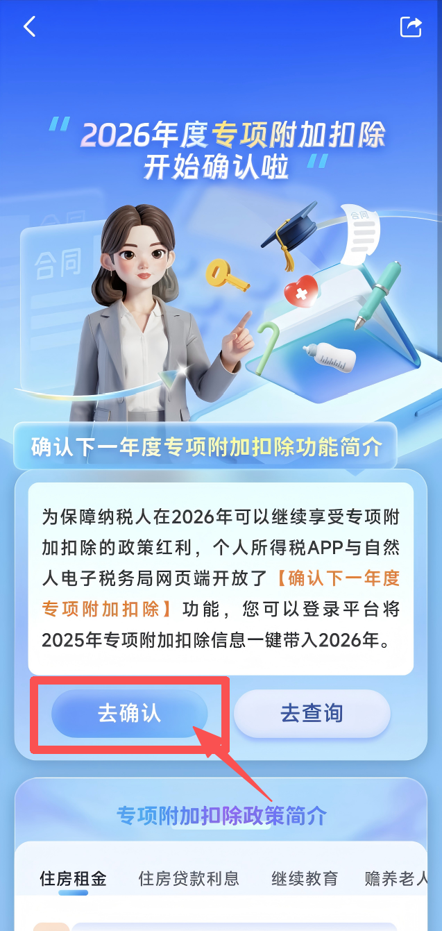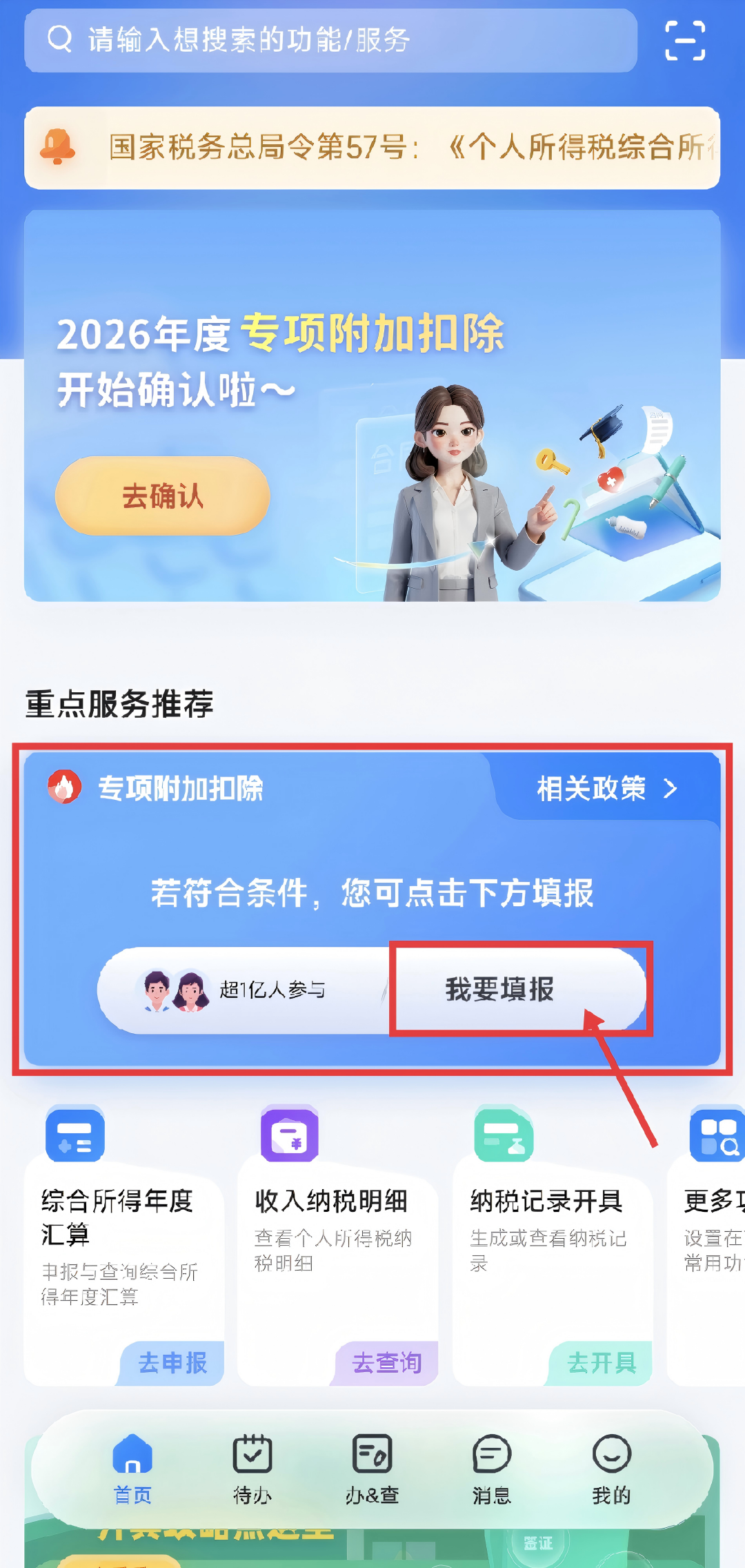 1.登录个人所得税APP,点击“2026年度专项附加扣除开始确认啦”中的“去确认”。