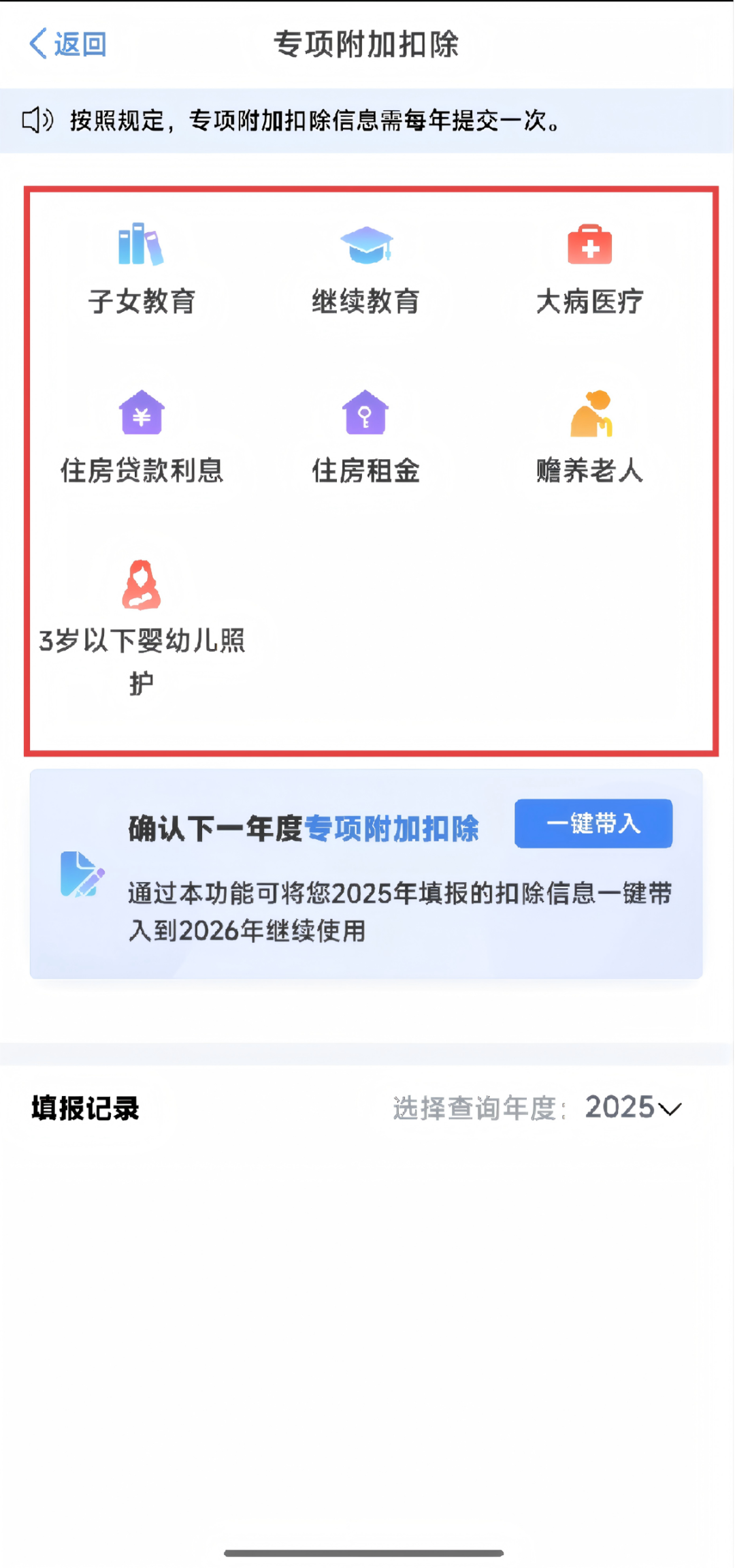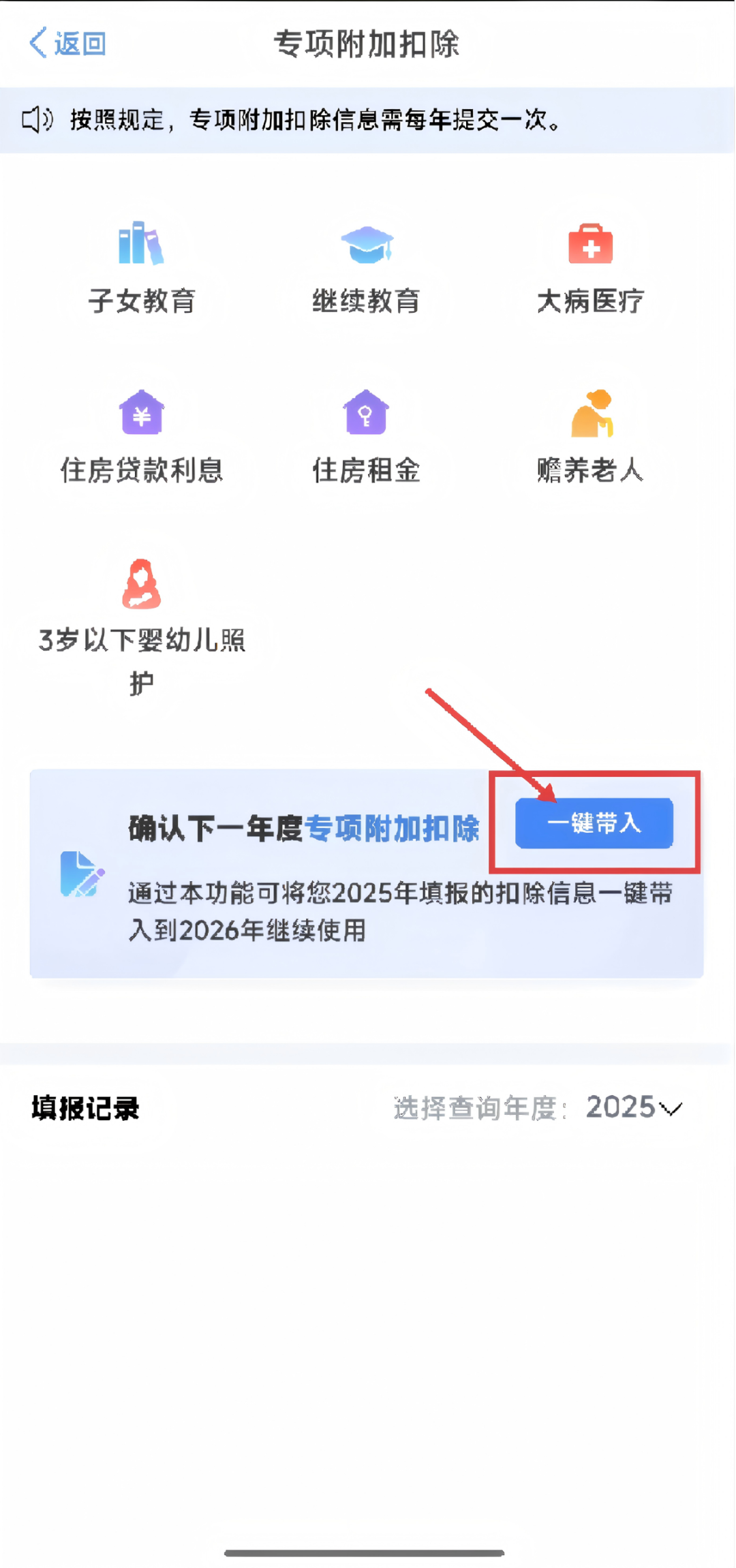 1.在专项附加扣除信息确认界面,点击“一键带入”,带入2025年度专项附加扣除信息,在弹出的对话框点击“确定”。
