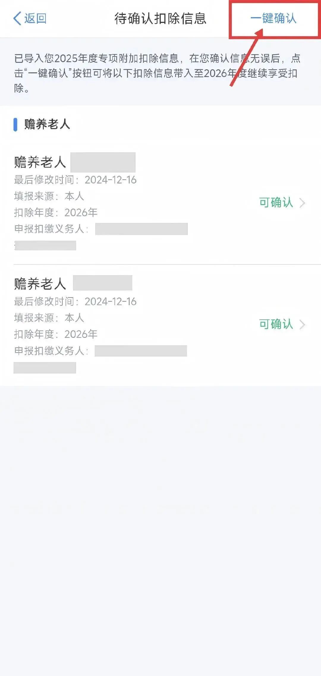 2.如您2026年度个人所得税专项附加扣除信息相比2025年度无变动,点击“一键确认”,在弹出的对话框点击“确认”即可。