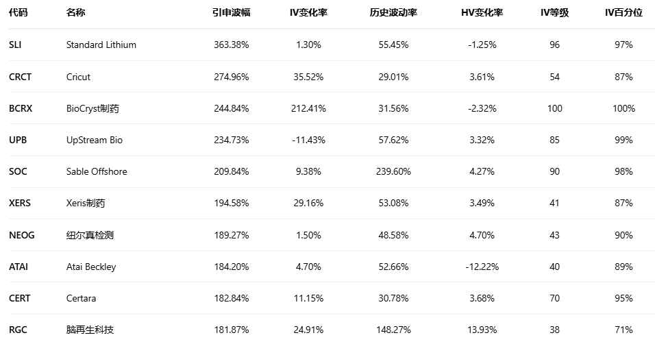 美股期权波动率排行榜前十(标的市值>100亿美元,且期权成交量>10万张)