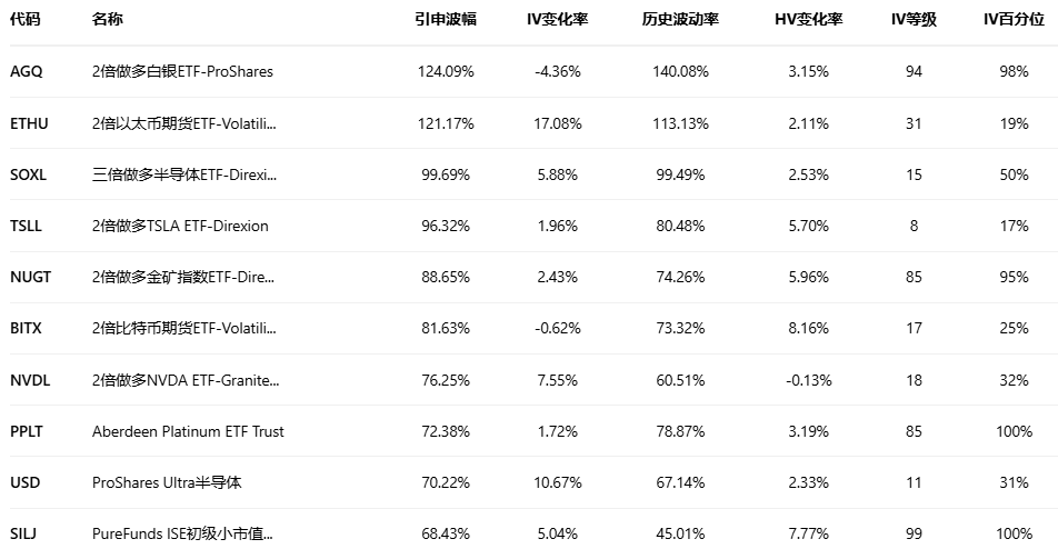 美股ETF引申波幅排行榜前十(标的要求:市值>100亿美元)